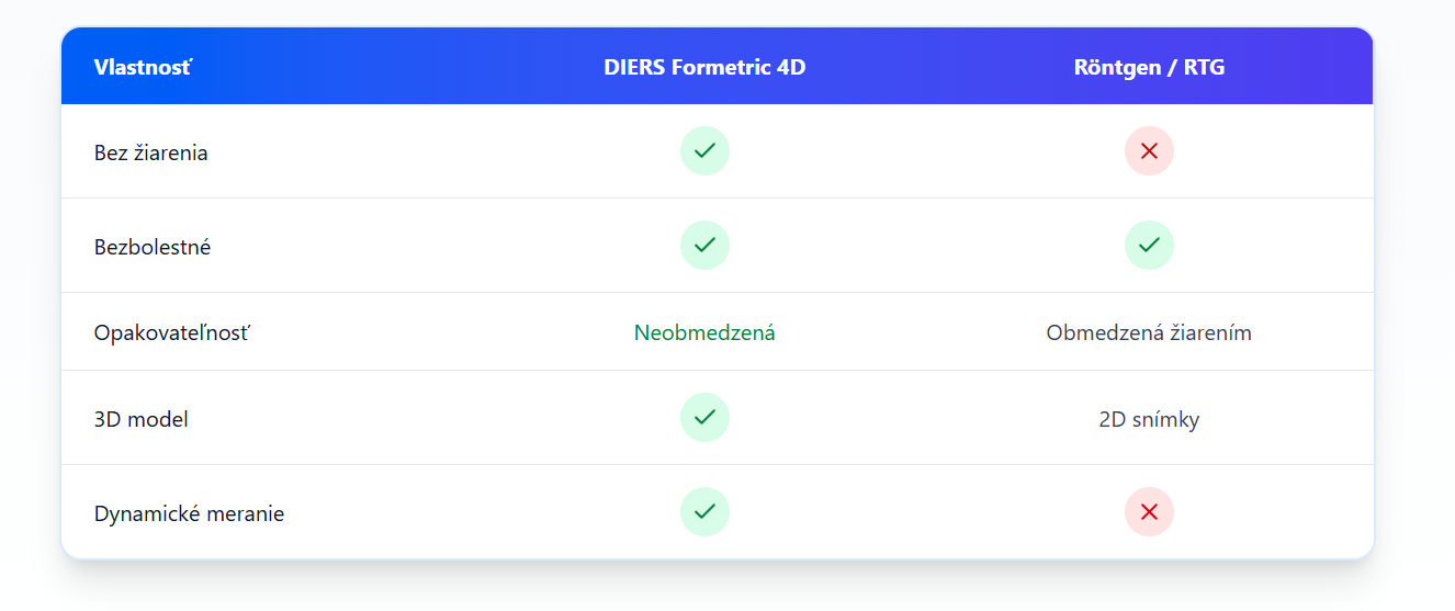 Na rozdiel od klasických RTG vyšetrení prístroj Formetric 4D nepoužíva röntgenové žiarenie. Všetky snímky sa vytvárajú pomocou svetelnej mriežky a optického skenera, takže je metóda absolútne bezpečná pre deti, dospelých, tehotné ženy aj starších pacientov.